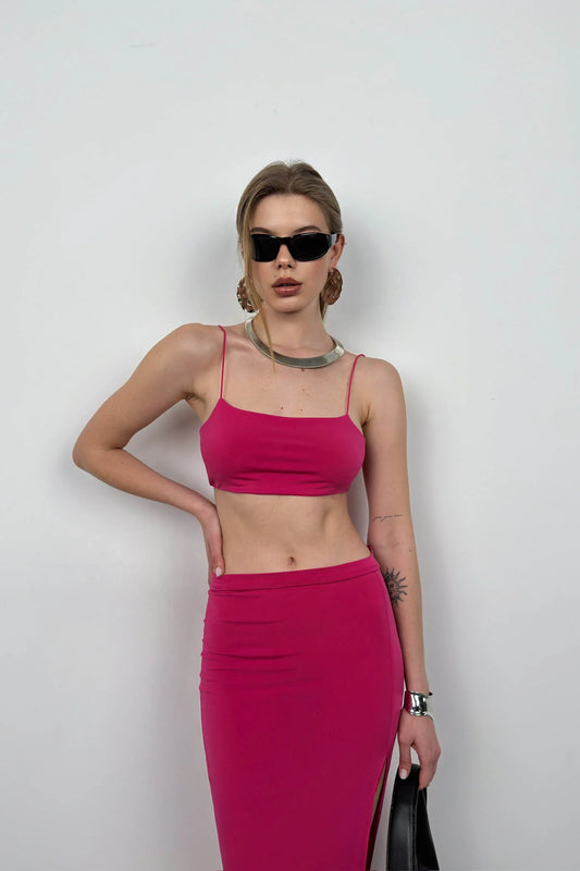 Suspender Crop Slit Fuchsia Skirt Set