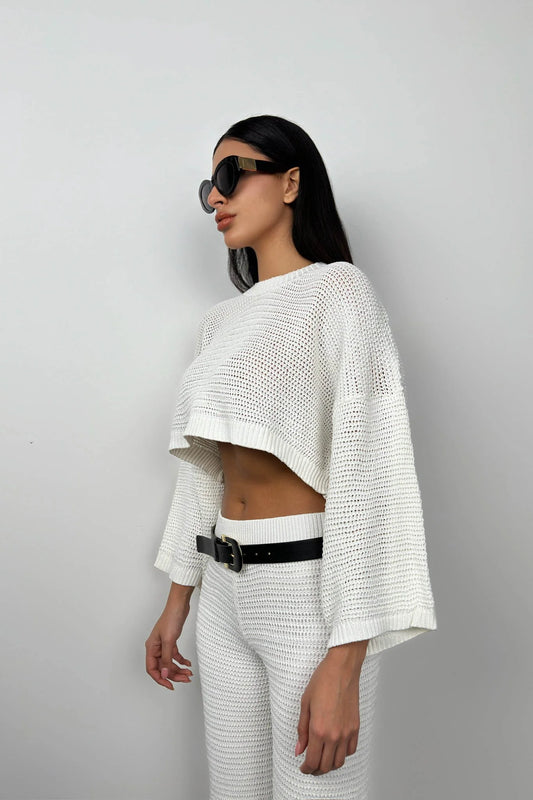 Oversize Knitted Blouse White Trousers Set