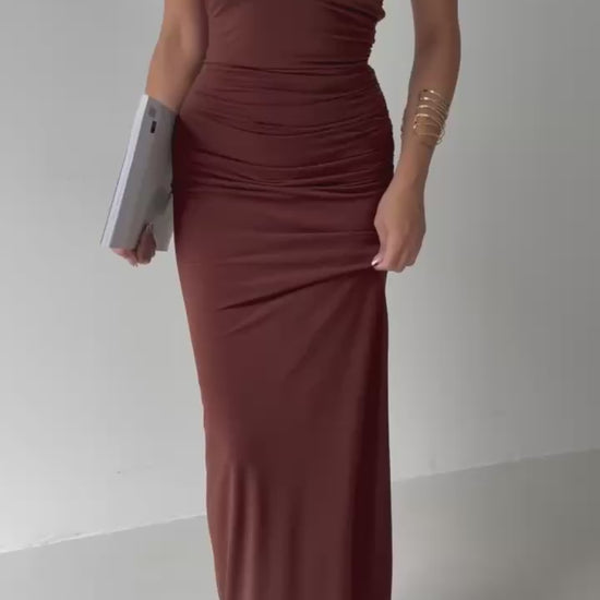 This maxi dress stands out with its accessory detail and form fitting silhouette Its luxurious design and high quality fabric ensure both comfort and an eye catching appearance An essential piece for any elegant occasion