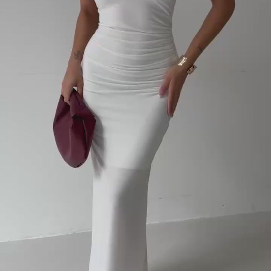 This maxi dress stands out with its accessory detail and form fitting silhouette Its luxurious design and high quality fabric ensure both comfort and an eye catching appearance An essential piece for any elegant occasion