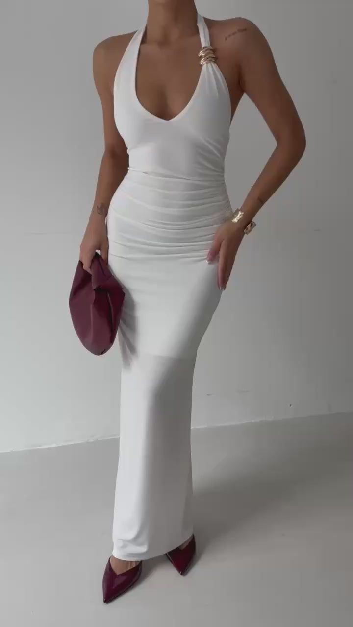 This accessory detail maxi dress combines bold design and modern elegance Featuring an adjustable accessory detail and halterneck tie it creates a sophisticated and confident look The soft stretchy fabric and figure hugging silhouette add comfort and style making it perfect for evenings out or special occasions