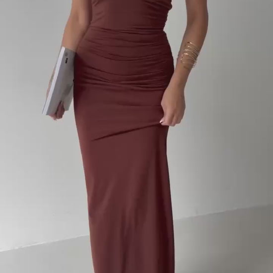 A sleek and sophisticated silhouette that flatters every curve. This body-hugging maxi dress features adjustable straps with gold-tone ring detailing, creating a striking open-back design. The soft, stretch fabric ensures comfort and elegance for any occasion.