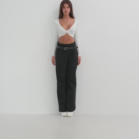 These trousers are the perfect blend of sophistication and versatility. The high waist sculpts the waistline, while the belt detail adds definition and edge. Ideal for both office wear and stylish evenings out.