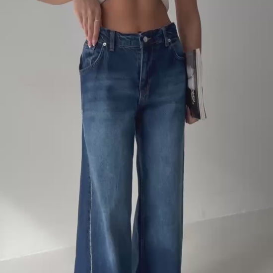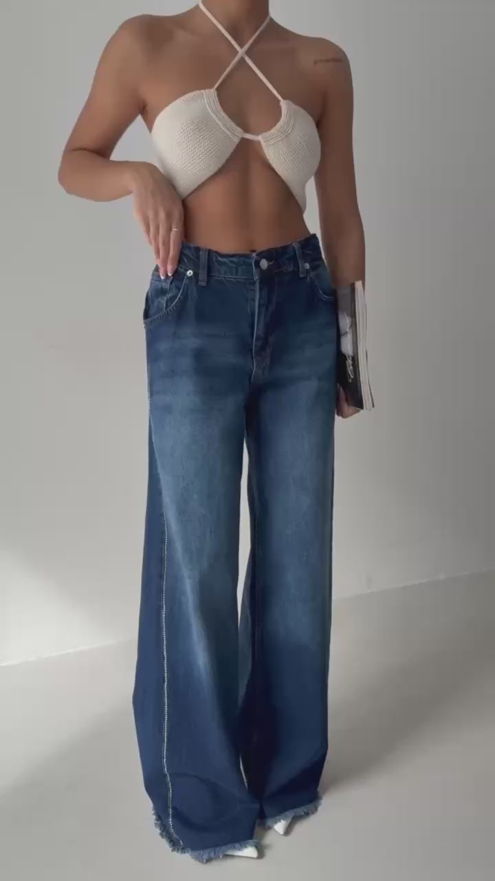 Add a sparkling twist to your everyday denim. These Rhinestone Side Stripe Jeans blend comfort and glamour with their flattering wide-leg silhouette and shimmering side embellishments.