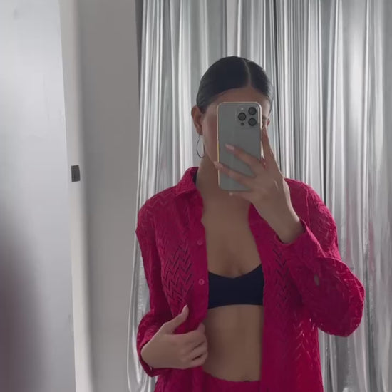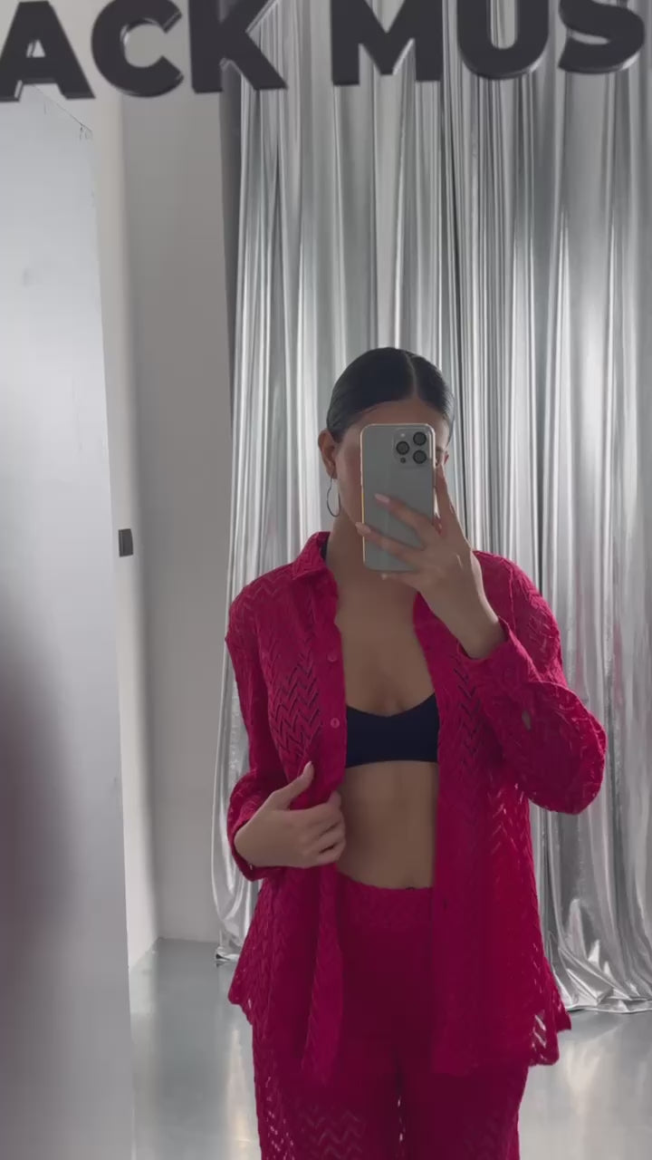 Breathe life into your summer wardrobe with this elegant Fuchsia two-piece set. Featuring a transparent embroidered shirt and matching wide-leg trousers, this set offers a bold yet refined take on laid-back luxury.