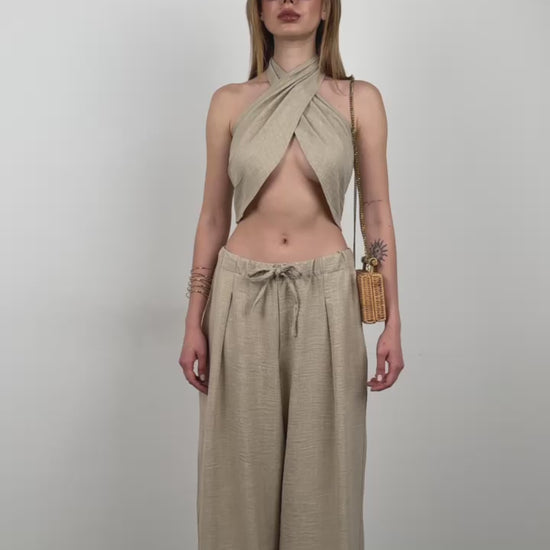 Elevate your summer wardrobe with this effortlessly elegant linen set, featuring a cross-tie halter crop top paired with high-waisted wide-leg pants. Perfect for beach getaways, resort days, or casual-chic evenings.