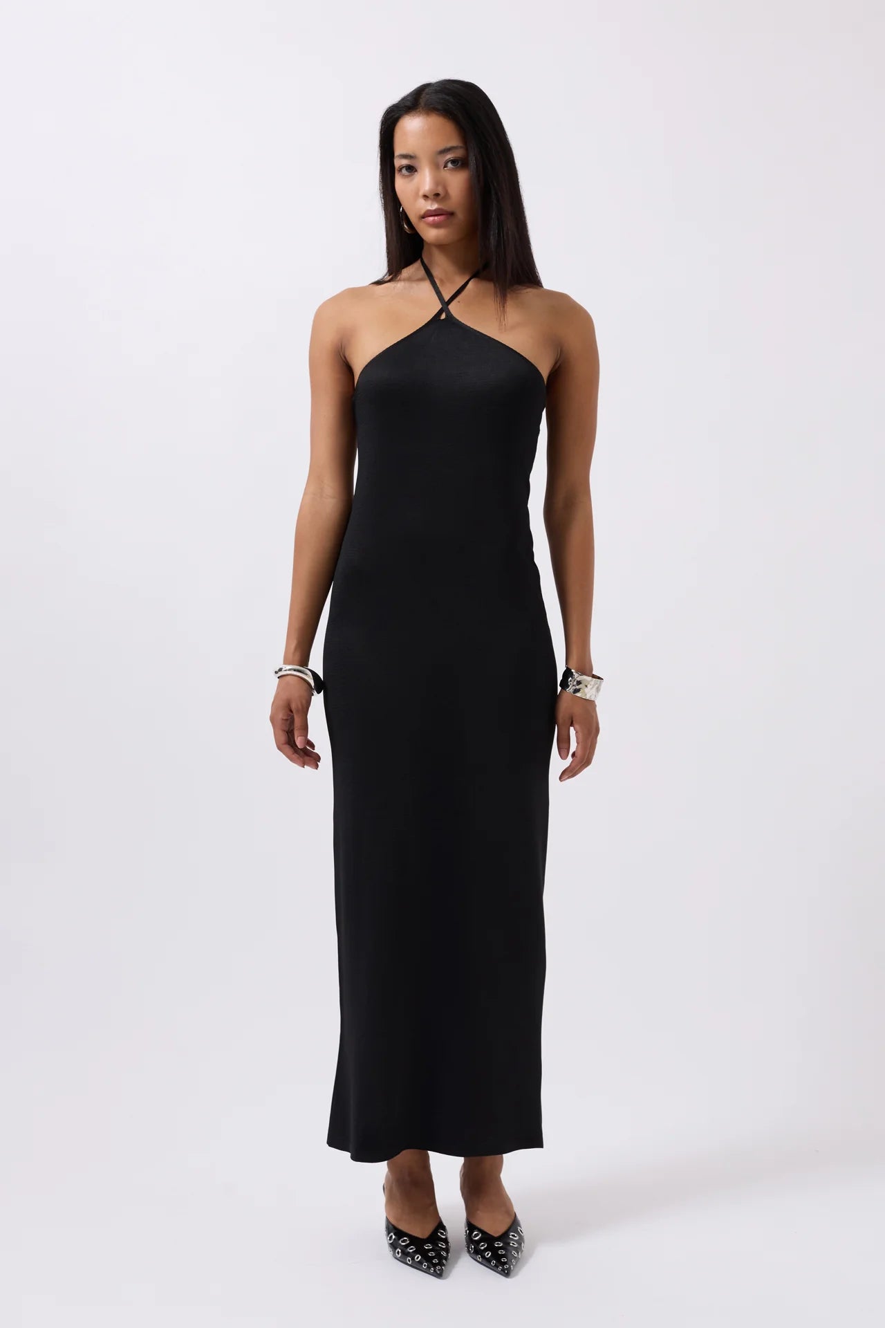 This cross strap maxi dress brings effortless style with a modern edge Featuring a lightweight knit texture and a halter neckline it creates a sleek and elongating silhouette The simple yet bold design is perfect for warm days casual events or evening outings