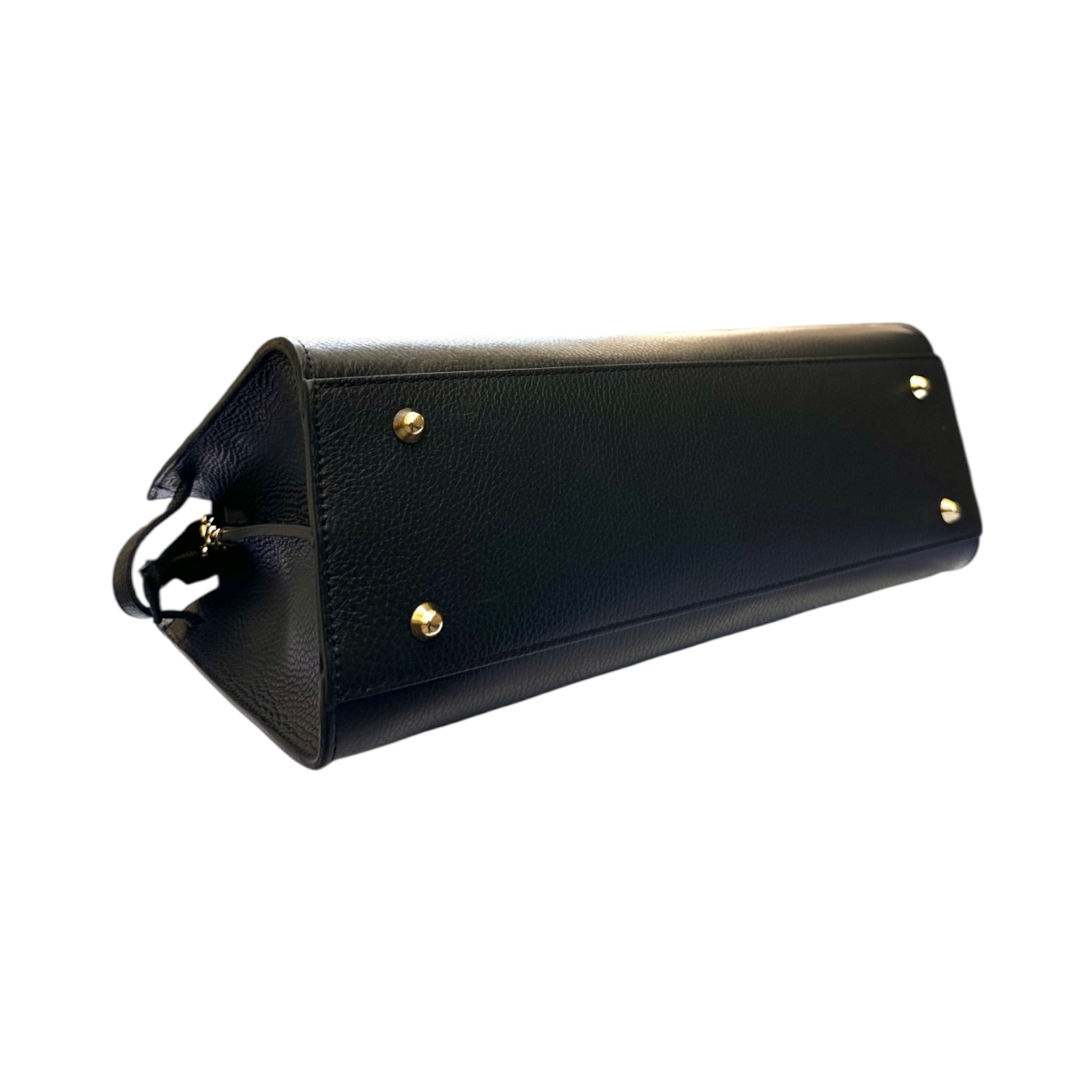 Elevate your wardrobe with this sophisticated structured tote, handcrafted in Italy from luxurious genuine leather. Its sleek black silhouette, enhanced with elegant gold-tone hardware and a polished turn-lock closure, offers timeless appeal and modern functionality. Perfect for both everyday elegance and refined occasions.