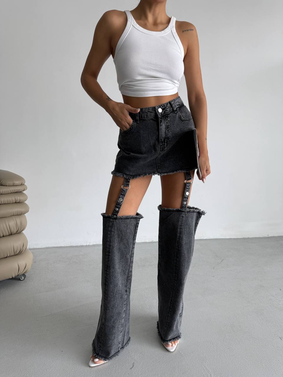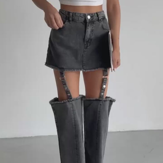 One high waist mini denim skirt with detachable leg panels