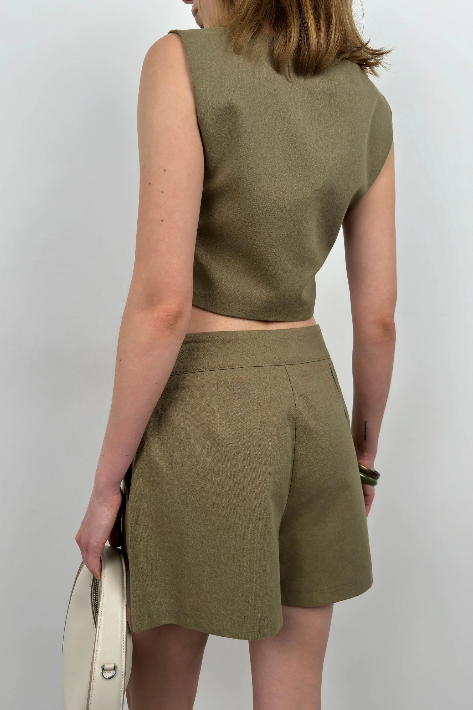 Elevate your summer wardrobe with this effortlessly chic khaki linen set. Featuring a cropped button-front vest and tailored shorts, this ensemble is perfect for warm days when you want to keep it cool and classy.