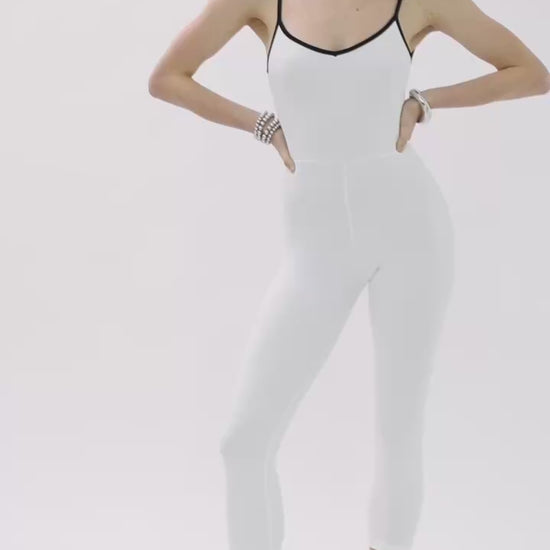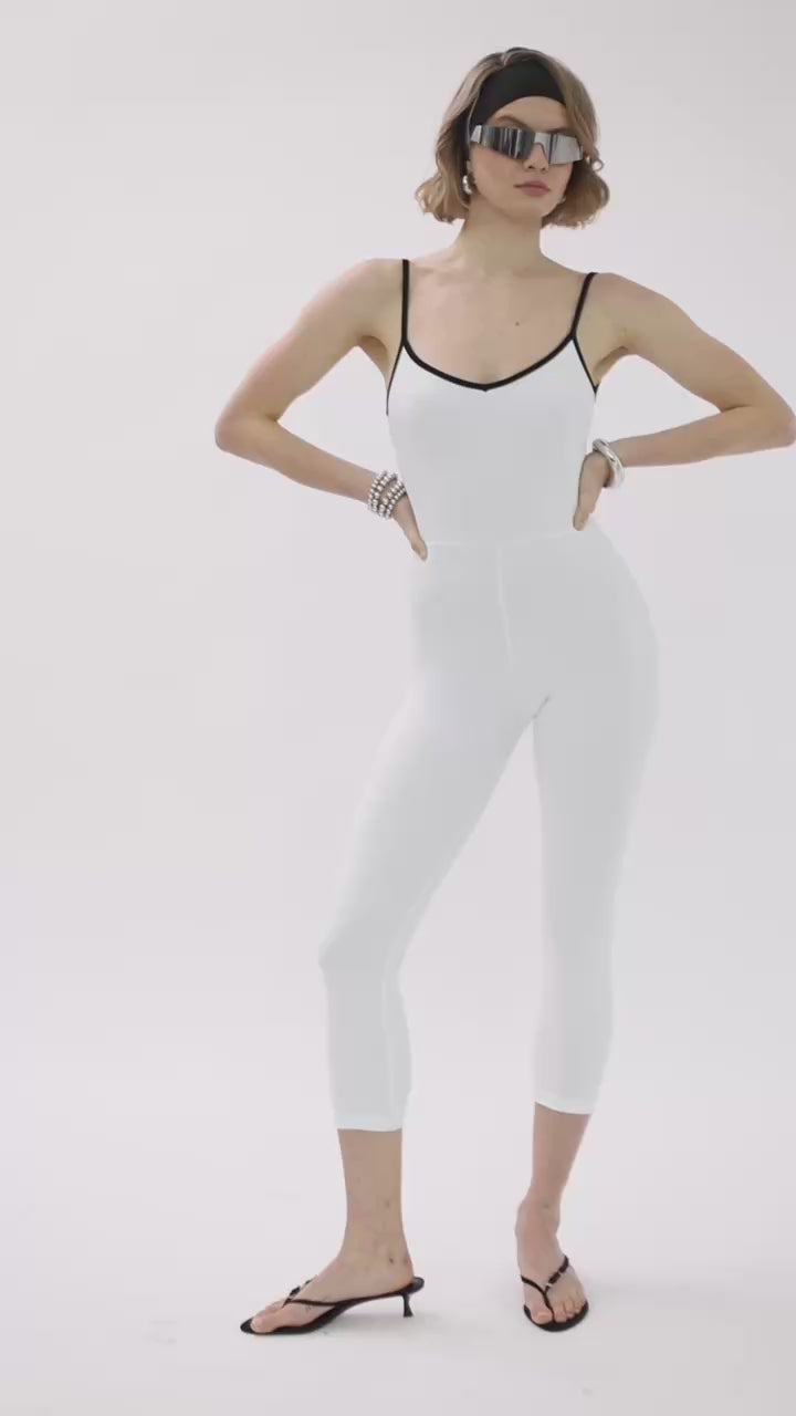 Elevate your athleisure style with this white body-hugging sports jumpsuit. Designed with thin straps and contrasting black trim, this one-piece offers a sleek, sculpting silhouette that moves with you from studio to street.