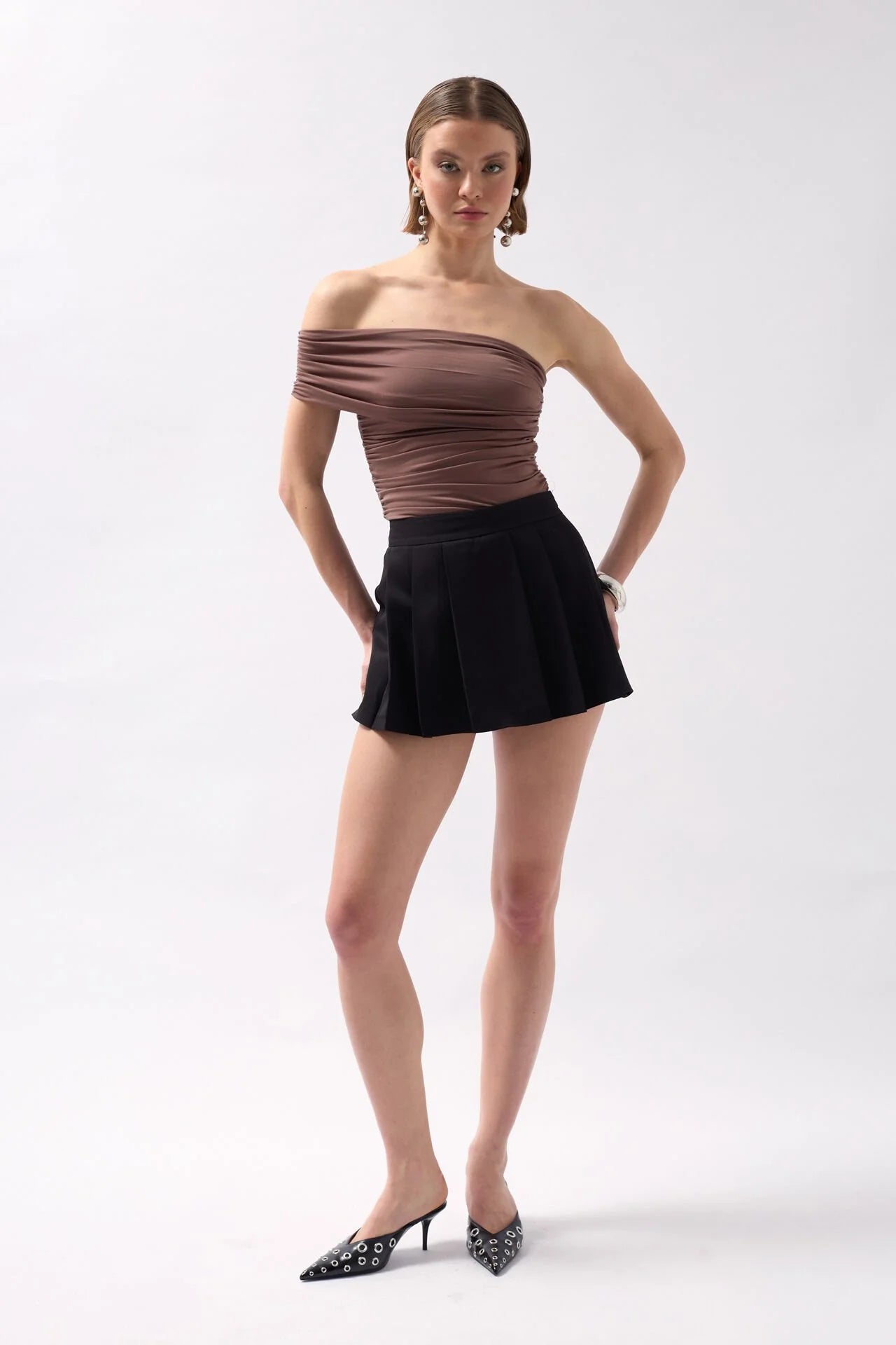 This pleated mini skort is a versatile choice for any season From casual daywear to chic evening looks it offers both sophistication and practicality Its quality material and modern design make it a standout piece