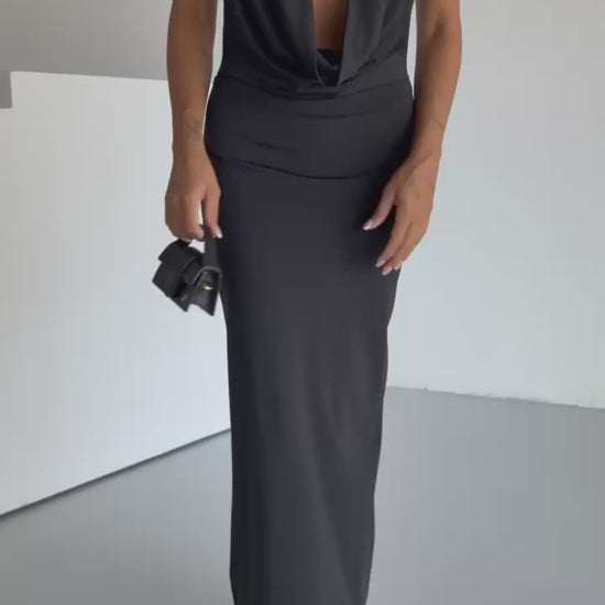 Designed to captivate, this black maxi dress features a dramatic plunging neckline with a shawl-style halter collar. The draped front creates an elegant, fluid silhouette that enhances the natural curves of the body. Ideal for evening events and special occasions where confidence and elegance are key.