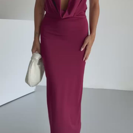 Designed to captivate, this burgundy maxi dress features a dramatic plunging neckline with a shawl-style halter collar. The draped front creates an elegant, fluid silhouette that enhances the natural curves of the body. Ideal for evening events and special occasions where confidence and elegance are key.