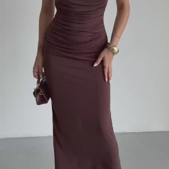 This maxi dress blends modern charm with timeless elegance Featuring wide straps and an open back it offers a bold and refined silhouette The ruched fabric enhances the body shape while the front slit adds a graceful sense of movement Perfect for evening occasions or formal events