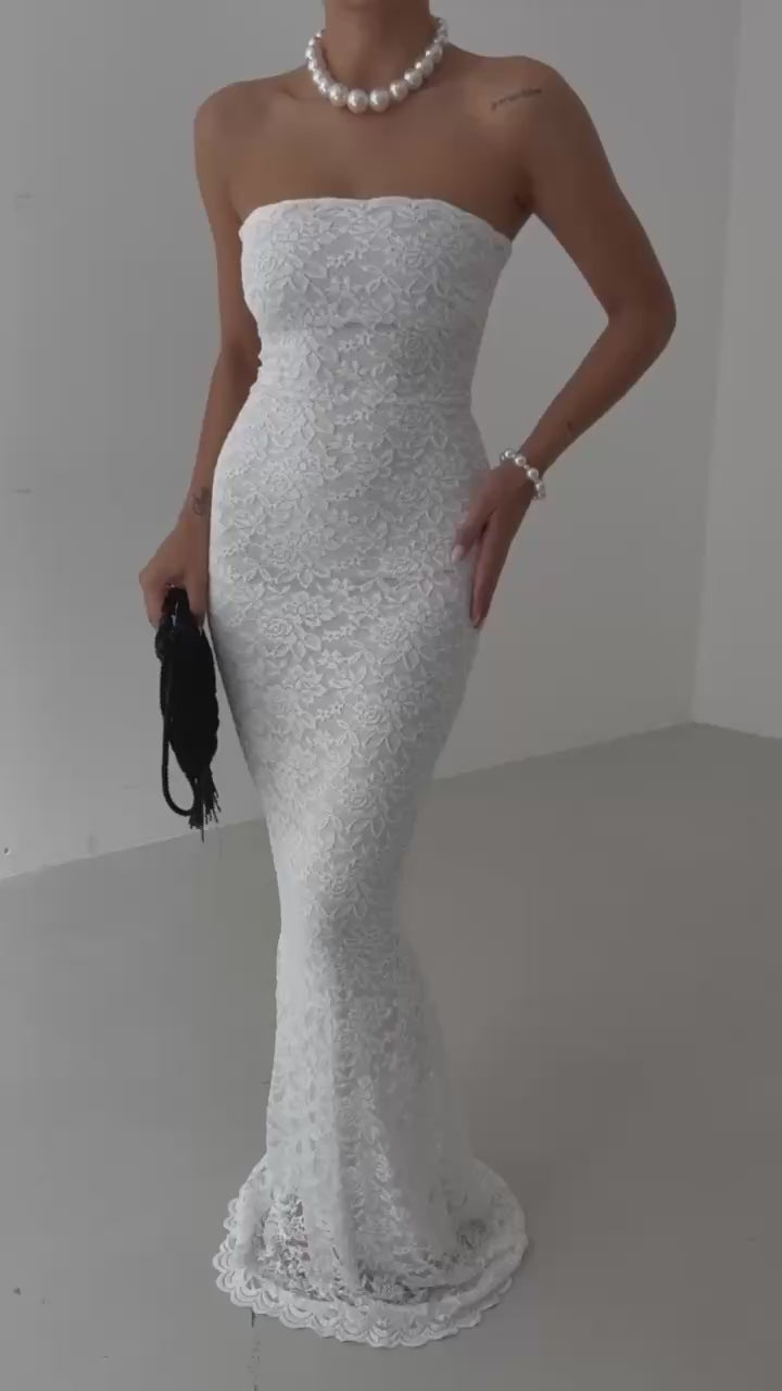 This strapless lace maxi dress is a stunning choice for special occasions Its premium lace and tailored fit ensure both comfort and elegance The timeless ecru color and sophisticated design make it a must have piece