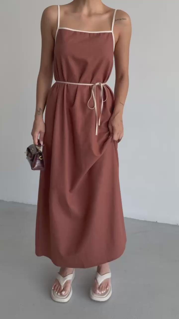 This relaxed fit maxi dress offers a breezy and elegant silhouette Crafted from lightweight linen with minimal strap detailing it is the perfect piece for effortless summer style The flowy cut and breathable fabric make it ideal for all day comfort whether at a resort or in the city