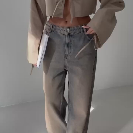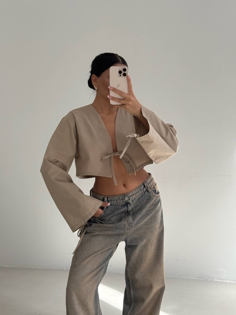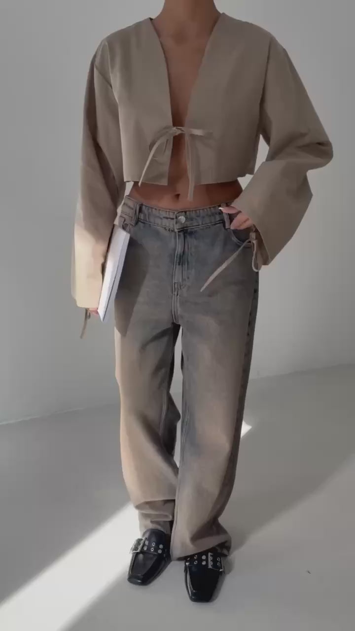 This refined two-piece look pairs a flowy tie-front blouse with wide sleeves and a tailored pair of high-waisted jeans Featuring clean lines and breathable cotton fabrics this set offers a balanced silhouette that's both relaxed and sophisticated — perfect for day-to-night wear