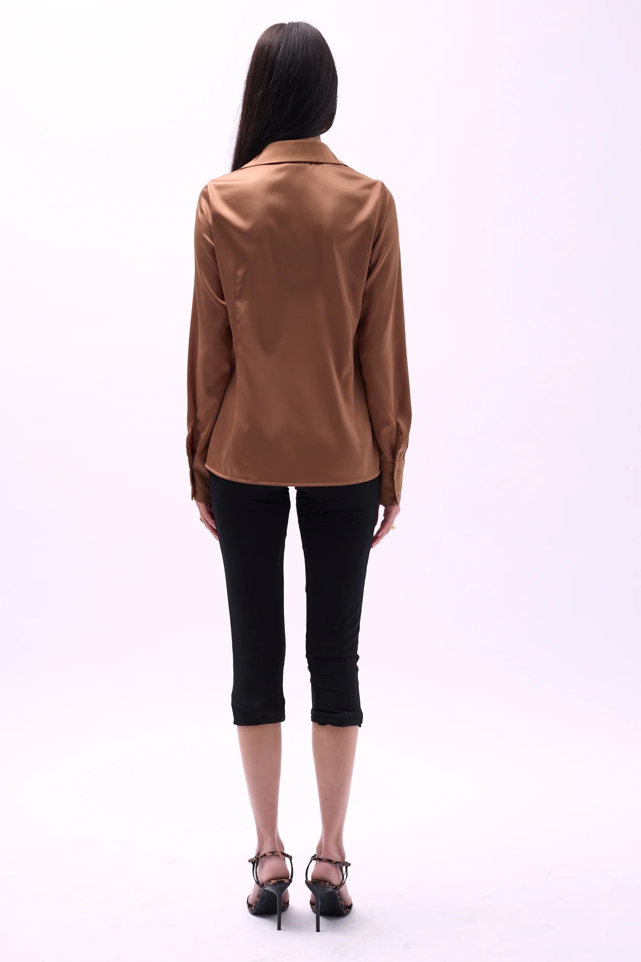 This satin shirt offers a fresh take on classic tailoring. The tie-front detail adds an air of effortless sophistication while the soft satin fabric keeps you comfortable all day. Perfect for pairing with high-waist pants for the office or wearing over a sleek crop top for evening events.